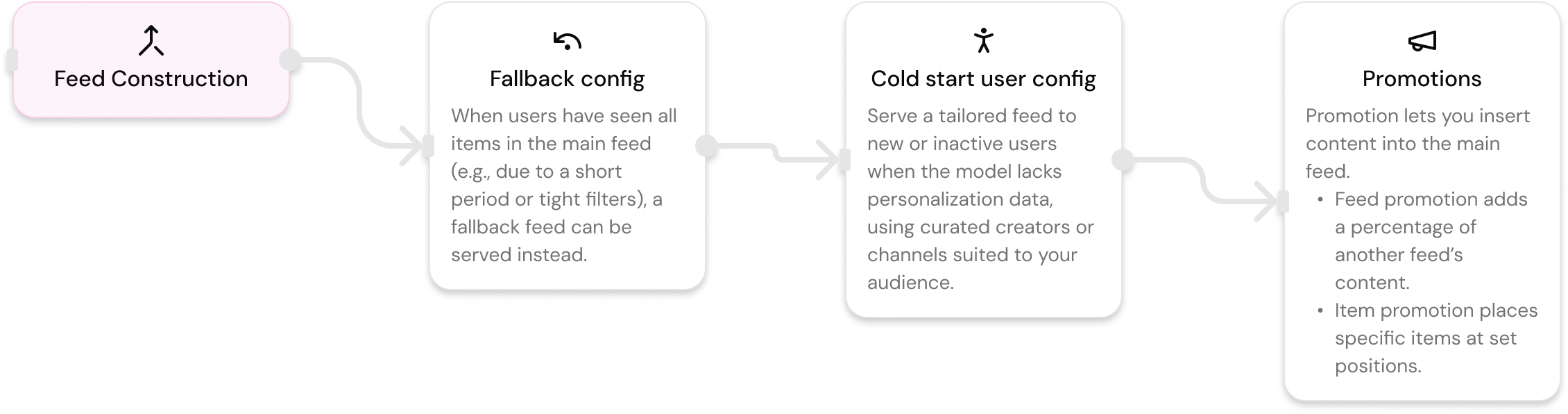 Add logic for fallback, cold starts, and promotion feeds. Make sure every user always sees something—even if they're new or inactive. Configure fallback feeds, customize cold start behavior, or mix other feeds directly into the feed experience.