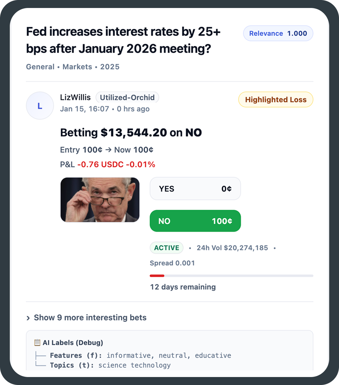 "question": "Fed increases interest rates by 25+ bps after January 2026 meeting?"Relevance Score (score)